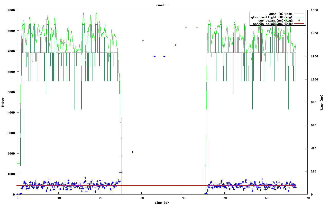 The figure to the right shows how (TCP) cross traffic causes uTP to essentially entirely stop sending anything. Its delay measurements are mostly well above the target during this time. The cross traffic is only a single TCP stream in this test.
