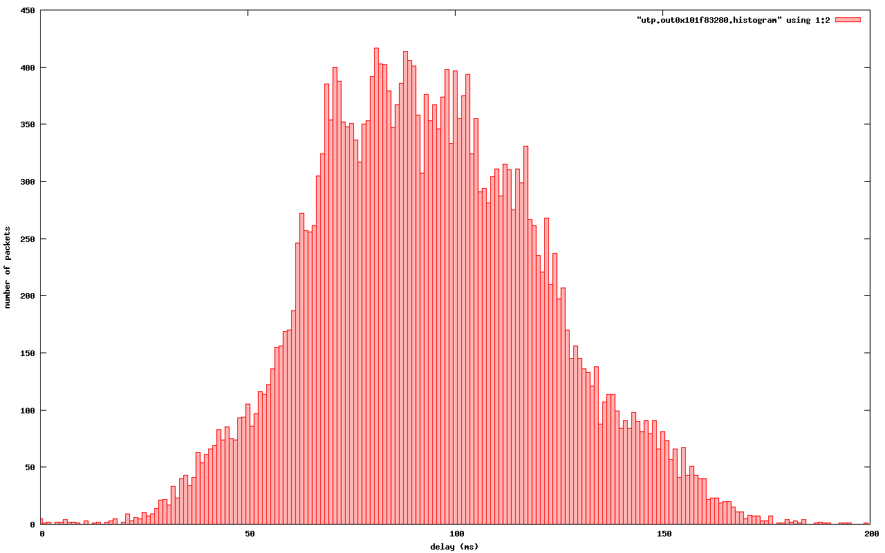 A histogram of typical delay measurements is shown to the right. This is from a transfer between a cable modem connection and a DSL connection.